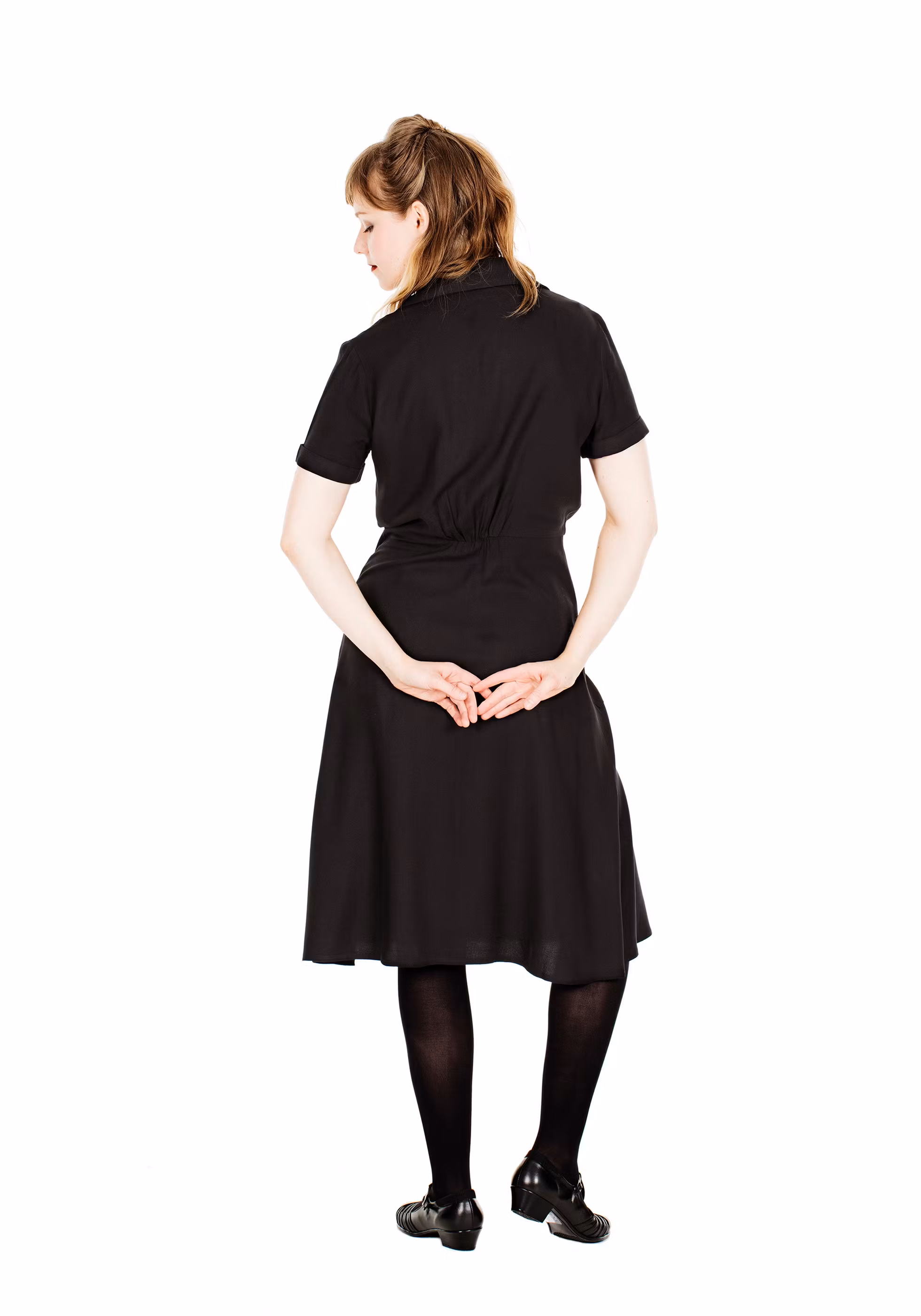 Här i en lyxig viskoscrepe i svart. Infärgad i Italien. Otroligt mjukt tyg med vackert fall. De exklusiva svarta knapparna förhöjer den genuina vintagekänslan.