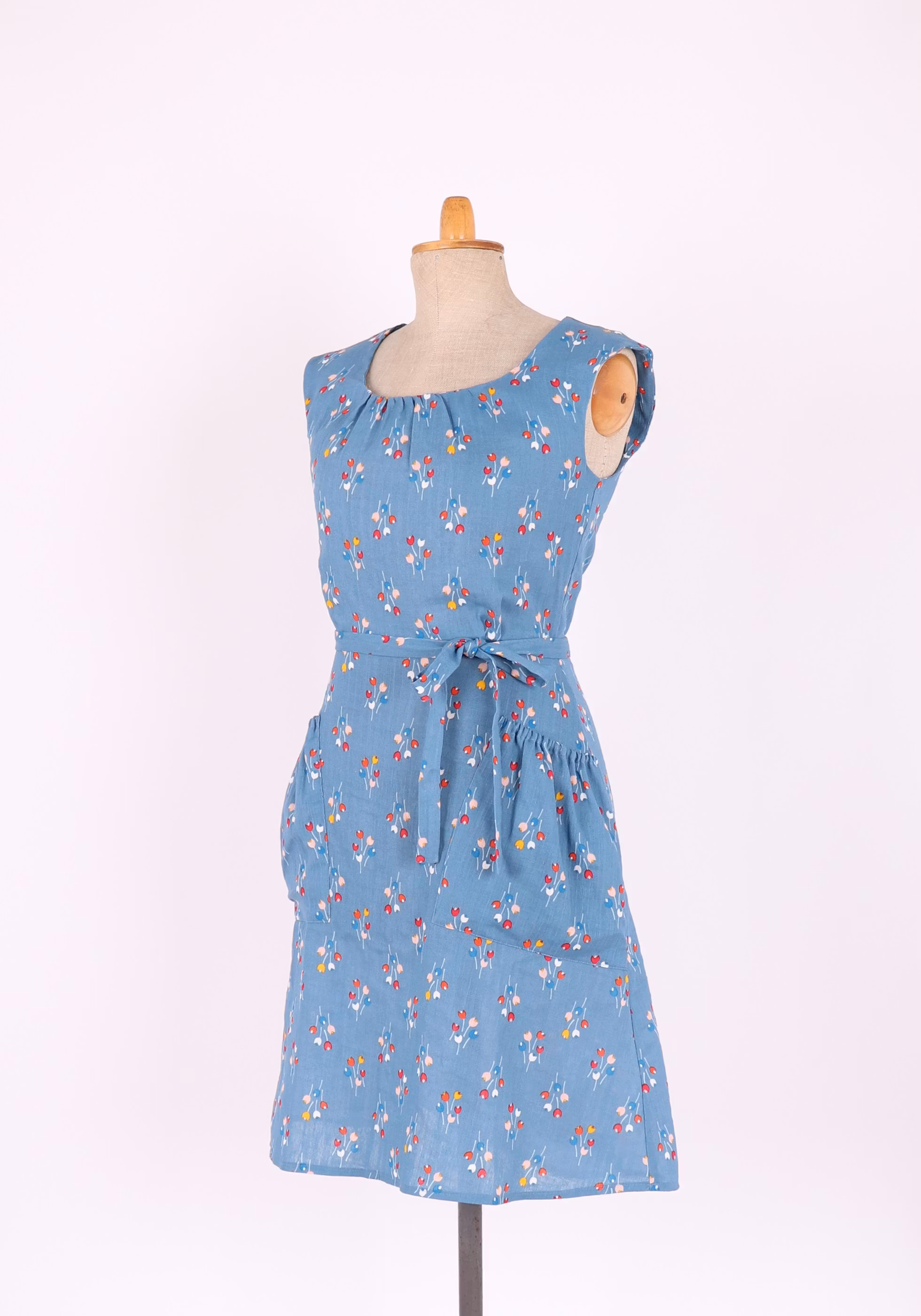 Klänningen Lisa är snyggt rynkad vid halsringning fram. Vidden över bysten samlas vid midjan med fyra veck och knytband. A-linjeformad kjol som räcker till strax ovanför knät. Stora lekfullt puffiga fickor med resårband i överkant. Sköna att vila händerna i. Vi har valt att dra ner axelsömmen något på axeln för att skapa en smickrande linje. Knäppes i ryggen med dragkedja.