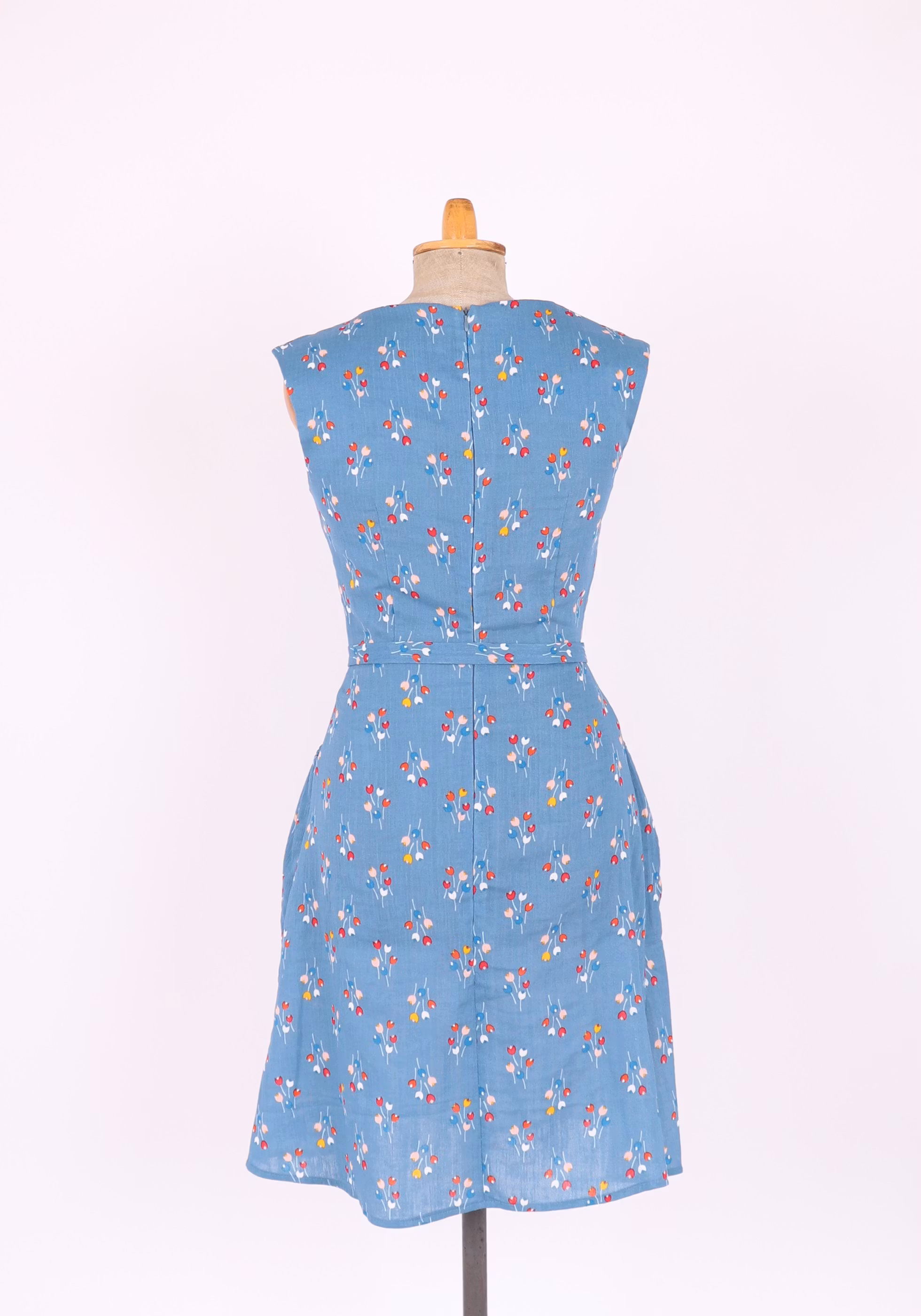 Här i en krinklad double gauze. Färgglada blombuketter på duvblå botten. Den krinklade effekten i tyget gör plagget lite stretchigt på bredden.